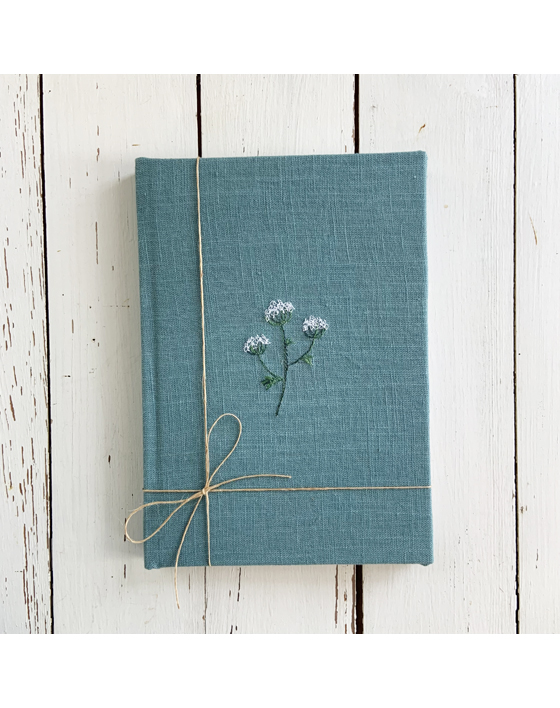 Decorated with a freehand machine embroidered cow parsley stem, this hard backed A5 portrait notebook is covered in a beautiful teal covered linen