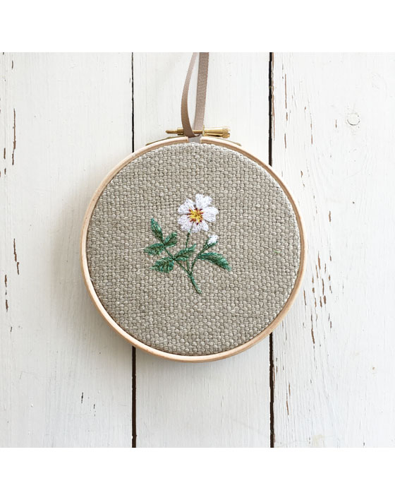 A little dog rose stem with bud, freehand machine embroidered onto natural linen and stretched within a 5″ wooden hoop.